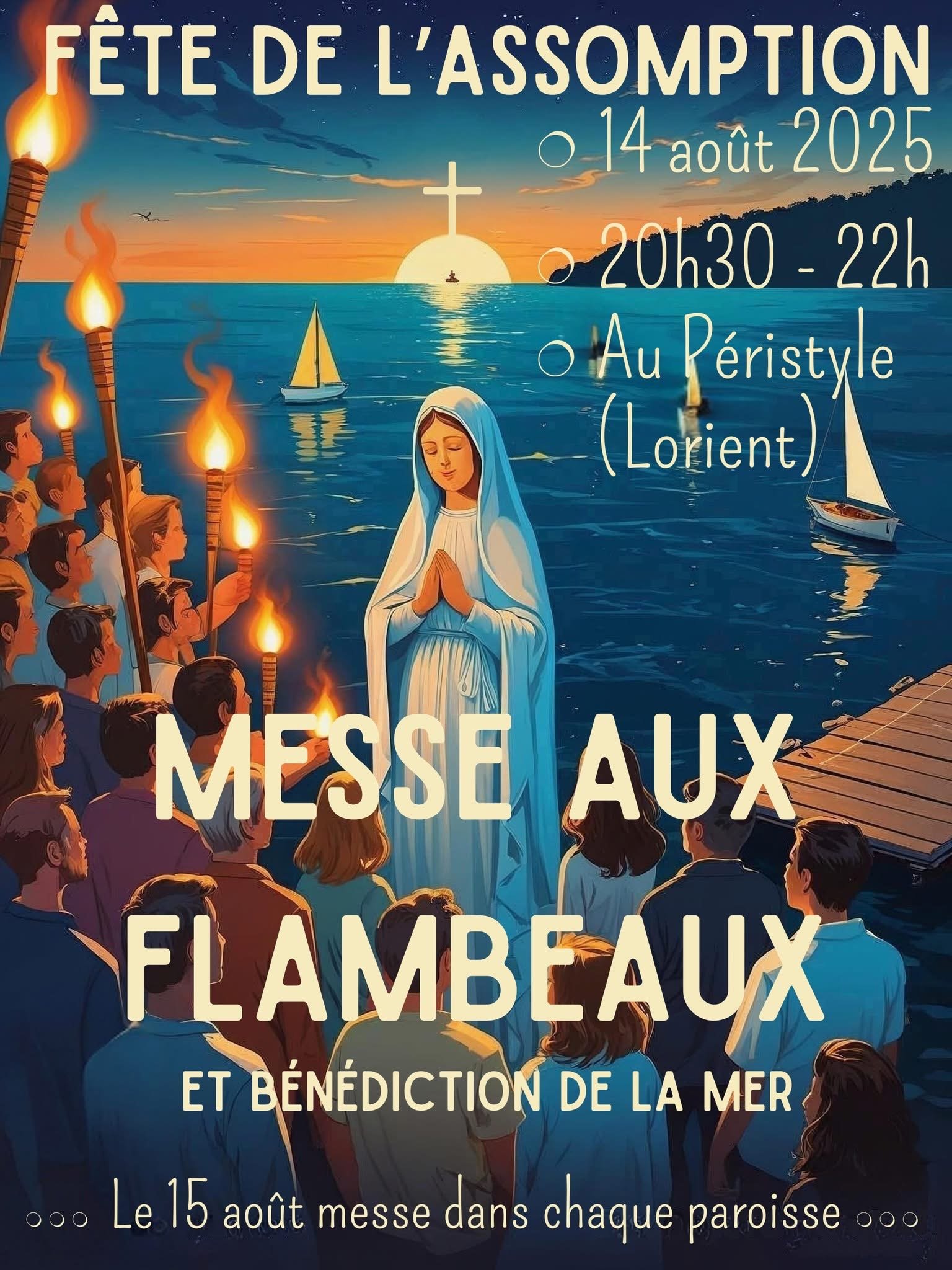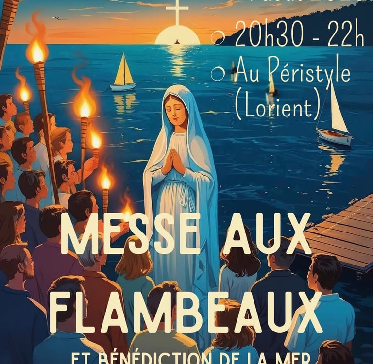 Nous avons le plaisir d'annoncer que la Messe de Vigiles de l'Assomption se tiendra le 14 août à 20h30 au péristyle de Lorient. Cette Messe revêt une importance particulière, car elle sera célébrée en mémoire des marins disparus en mer. C'est un moment de recueillement et de solidarité, où nous nous unirons pour honorer leur mémoire.